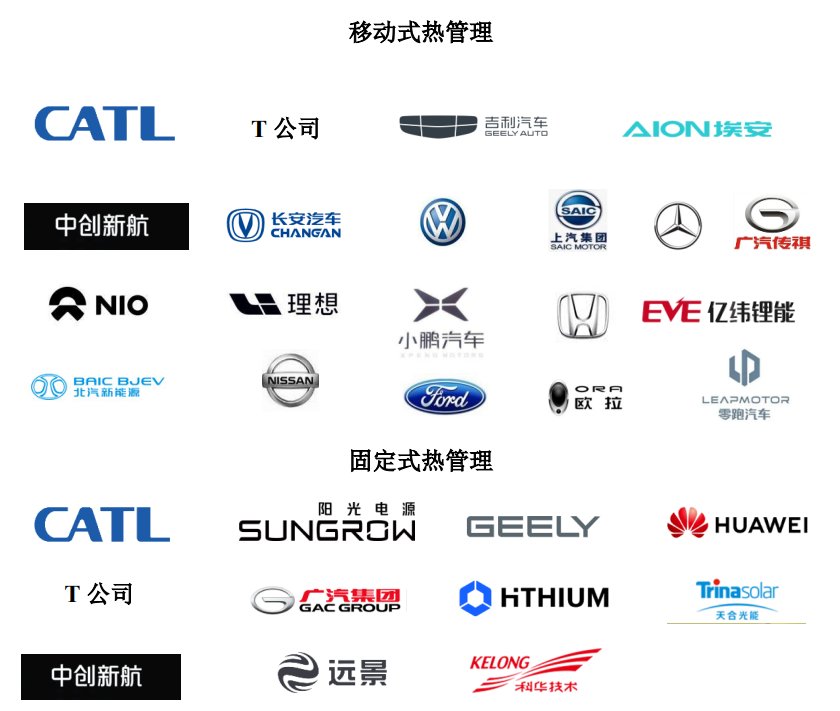 在新能源汽车动力电池热管理领域,公司于2012年起即与宁德时代开展合作研发,是宁德时代的战略供应商,产品配套供应T公司、蔚来汽车、小鹏汽车、理想汽车、哪吒汽车、零跑汽车、吉利汽车、长安汽车、广汽集团、长城汽车、上汽荣威、东风日产、奔驰、大众、奇瑞汽车、赛力斯等多家汽车品牌。