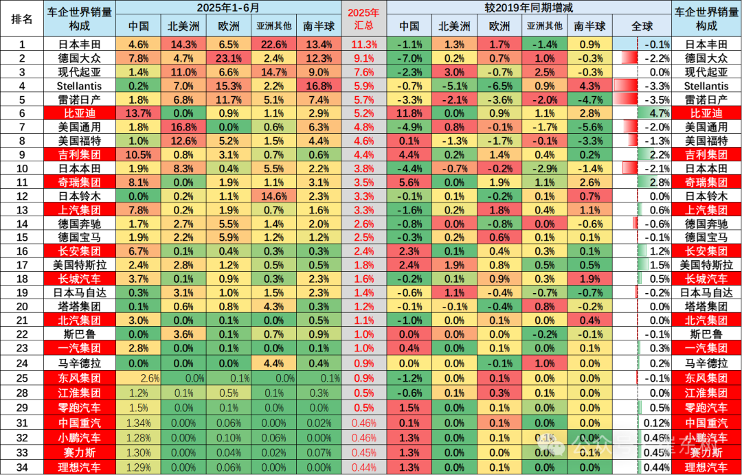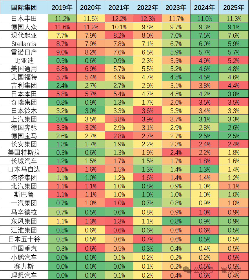 韩国现代汽车的走势较平稳,2025年1-7月达到7.6%,较2019年微增0.01%,韩国现代集团在北美和亚洲其它市场表现很好,但在中国因产品力不强而持续走势偏弱。