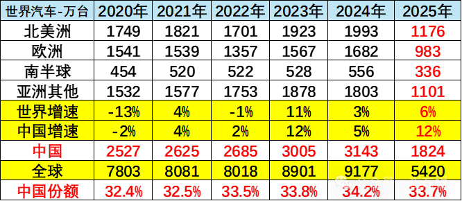 2020年以来中国的世界份额持续提升,到2023年达到33.8%,2024年中国车市达到34.2%,2025年1-7月份中国车市达到世界33.8%,已经是很好的。