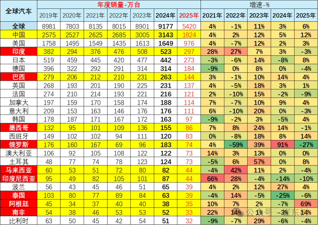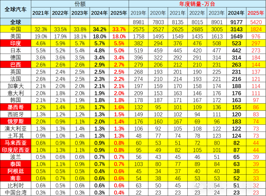 2025年1-7月的全球汽车销量增长6%,其中中国汽车销量1824万台、增长12%;美国销量976万台、增3%;印度销量297万台、降3%;日本销量273万台、增8%;德国销量184万台、降4%。目前看中国市场最有活力,增速快。俄罗斯市场下滑严重,墨西哥的增速放缓,而南美的阿根廷等市场表现较好。