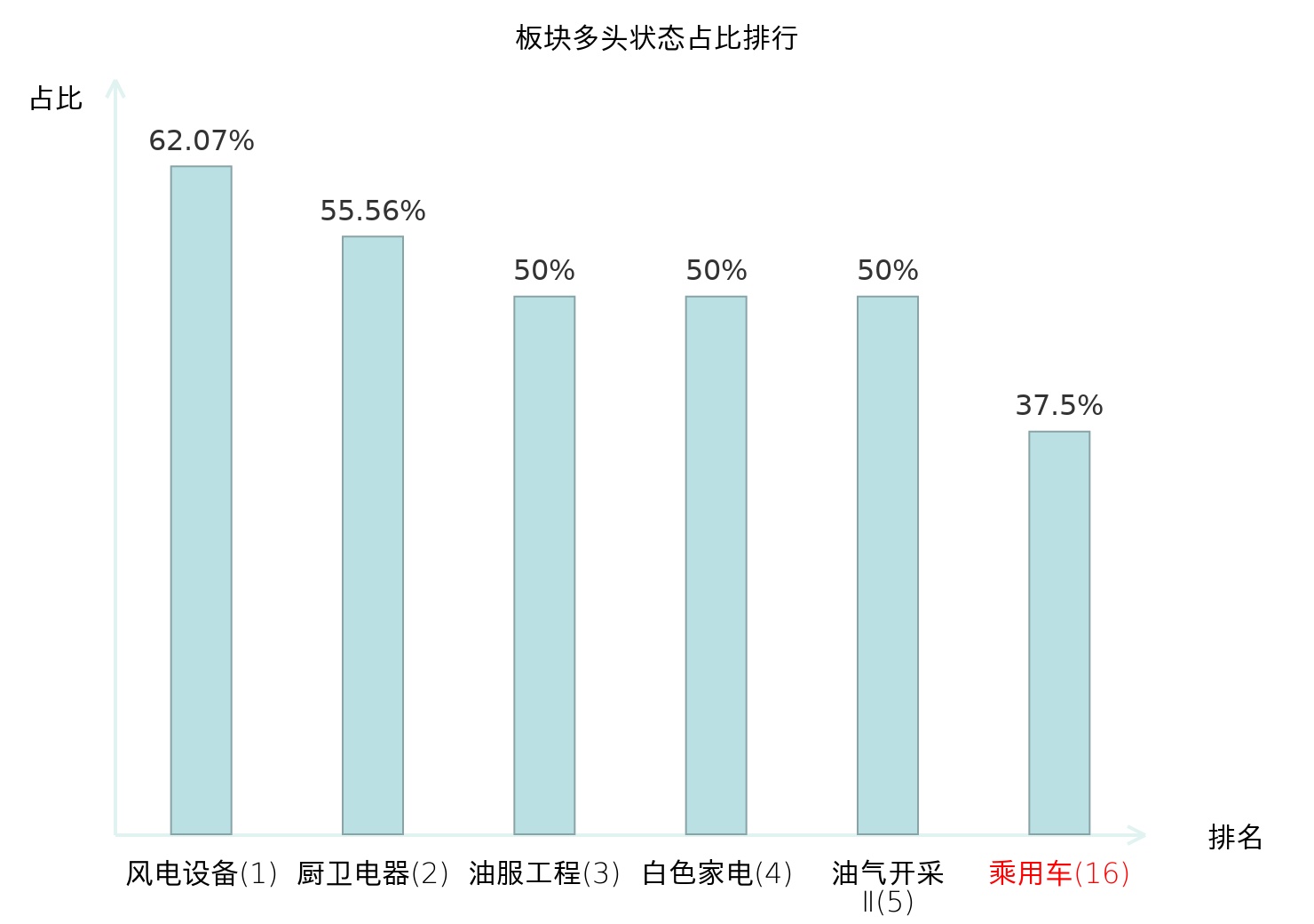 全市场所有行业板块中主力多头状态占比排名中,风电设备板块位居第一。专业连锁Ⅱ板块名次提升最快,较昨日上升65位。