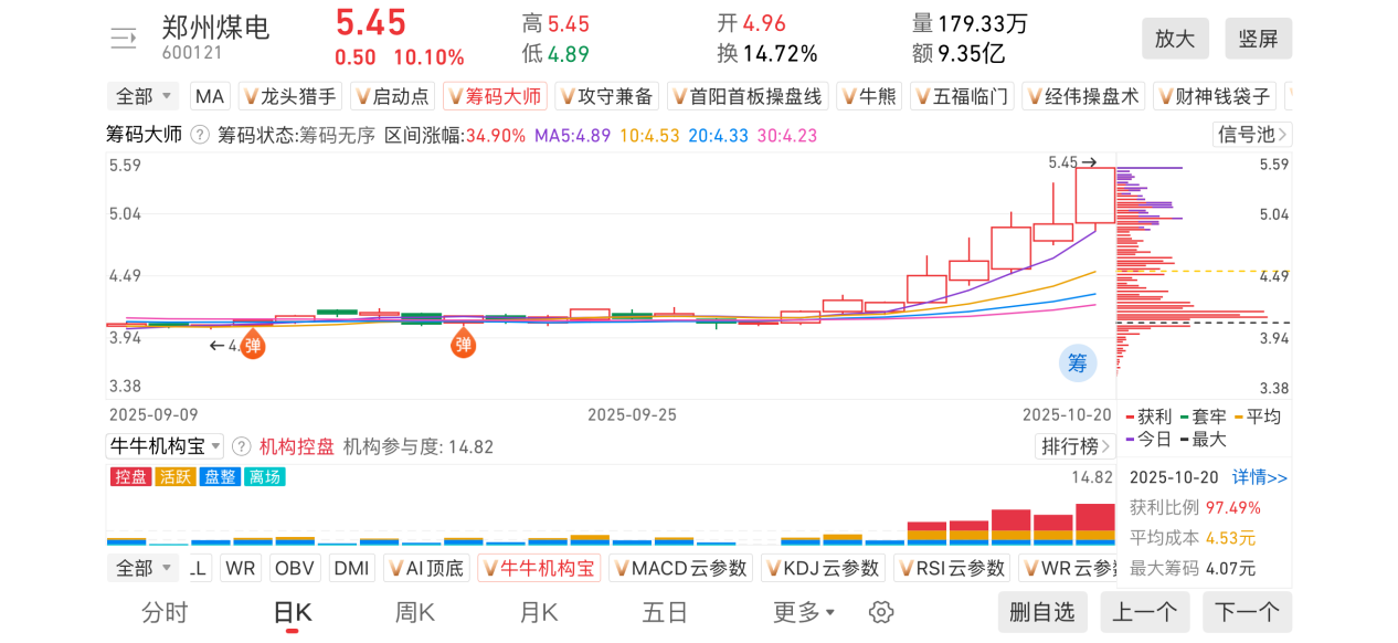 3)20251014-郑州煤电-【筹码大师】和【牛牛机构宝】-近期出现弹信号且底部量柱由绿转红