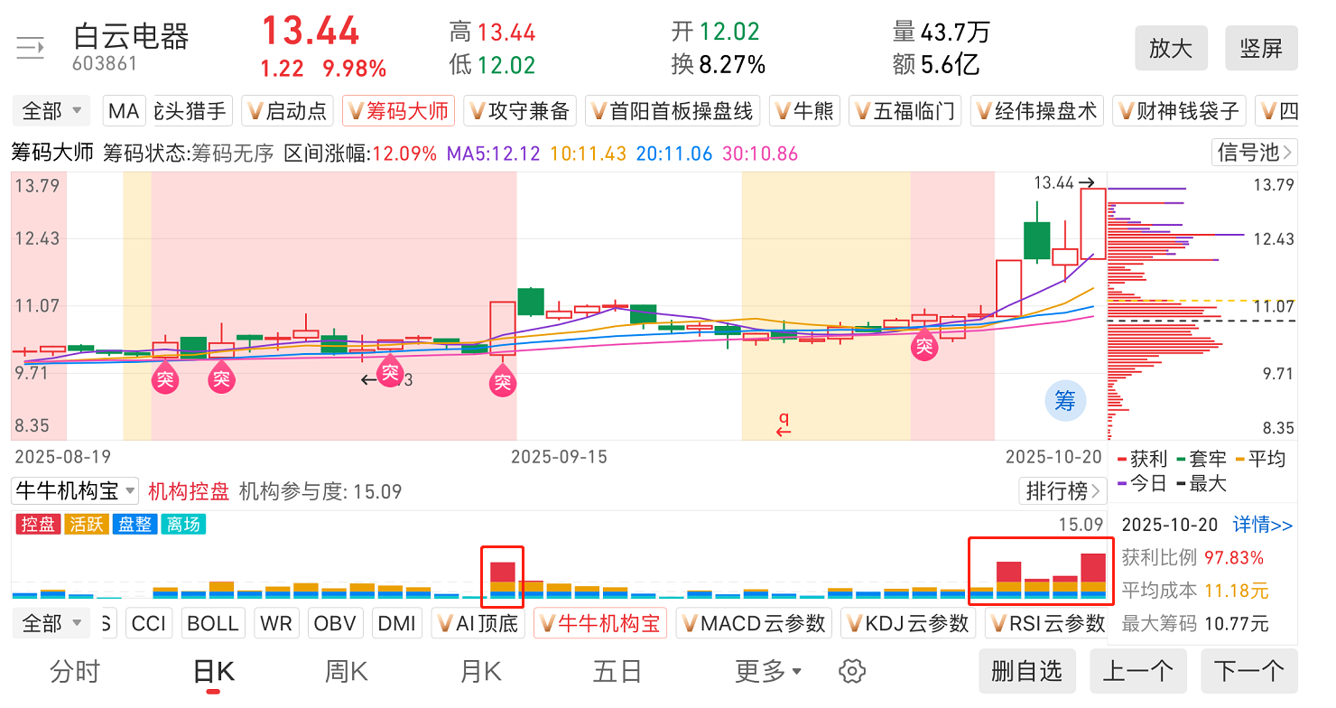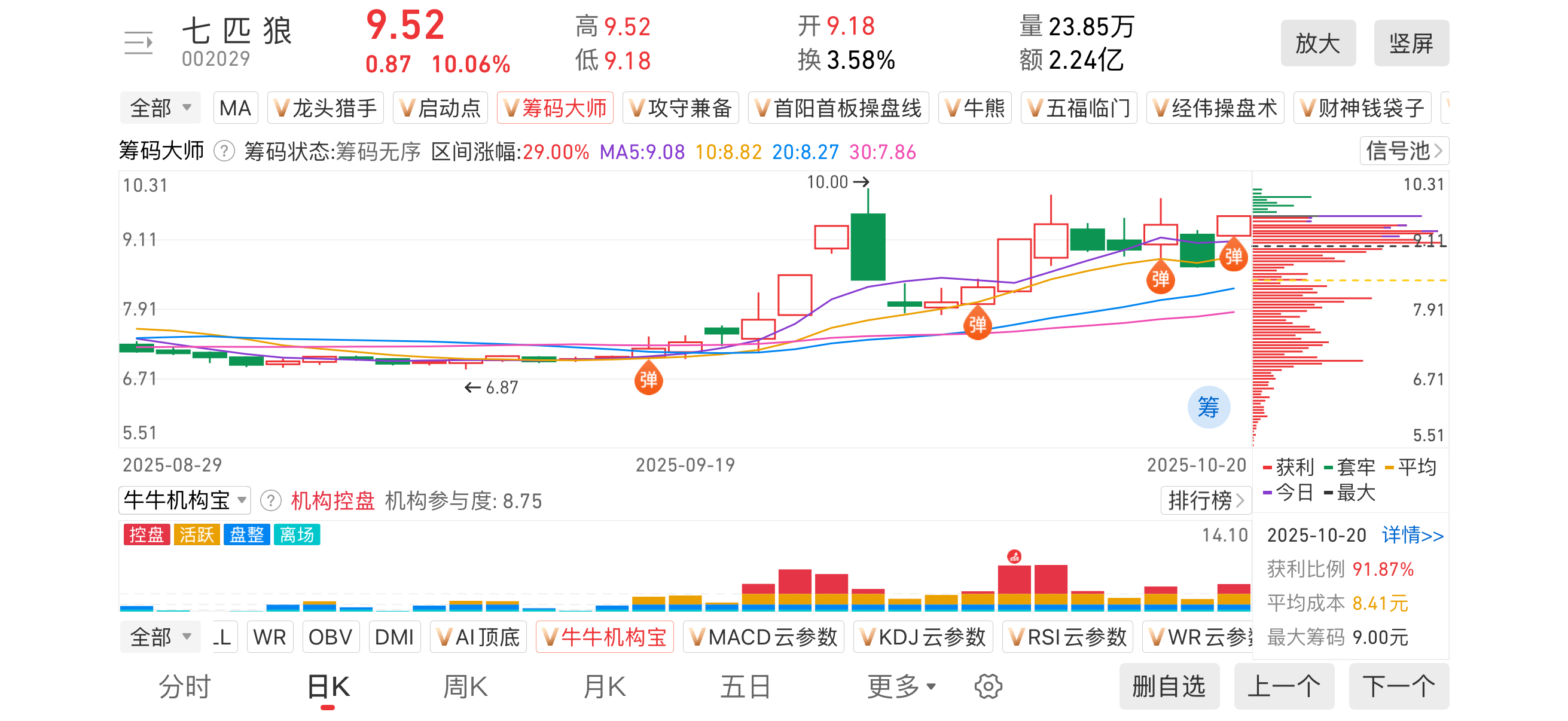 1)20251020-七匹狼-【筹码大师】和【牛牛机构宝】-近期出现弹信号且底部量柱由绿转红