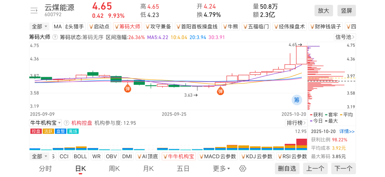 2)20251008-云煤能源-【筹码大师】和【牛牛机构宝】-近期出现弹信号且底部量柱由绿转红