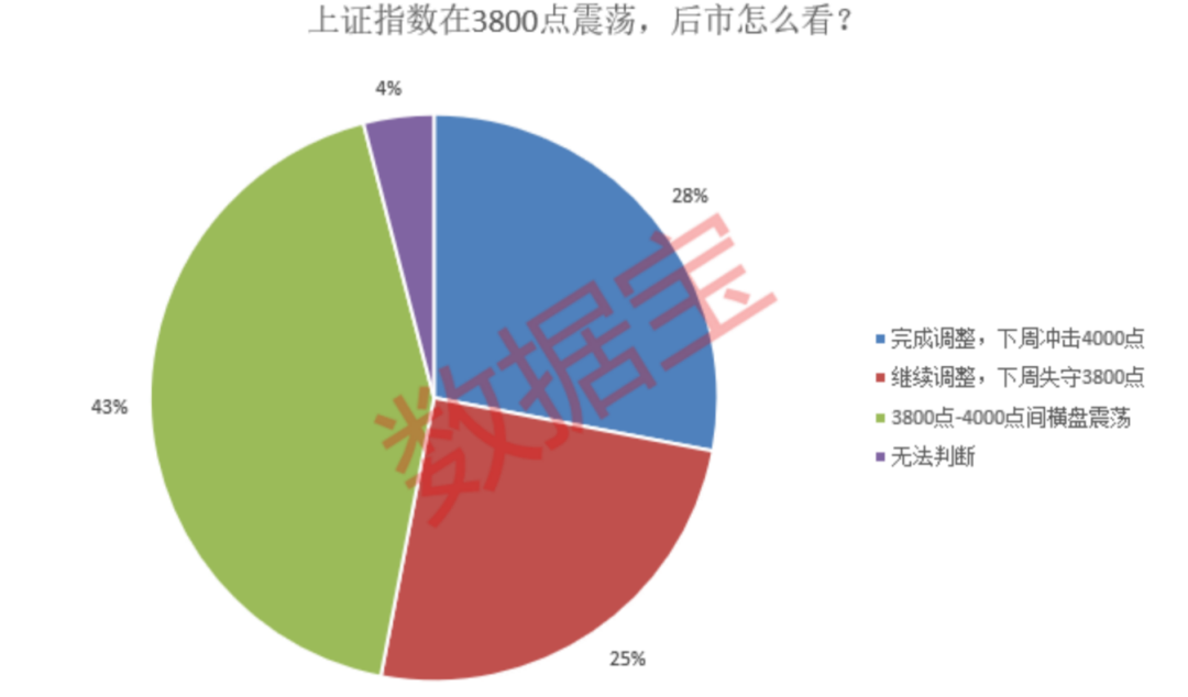 对于下周A股走势,受访者观点出现较大分歧。最为主流的是“3800点-4000点间横盘震荡”,占比达到43%;看涨与看跌的受访者占比基本持平,认为“完成调整,下周冲击4000点”与“继续调整,下周失守3800点”的占比分别为28%、25%。