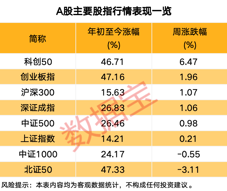 本周(9月22日至26日),A股市场成交规模维持高位,连续5日在2.1万亿元以上。指数方面,上证指数一周小幅上涨0.21%,最新报3828.11点;深证成指上涨1.06%,创业板指上涨1.96%。科创50指数累计上涨6.47%,涨幅居前;北证50指数下跌3.11%,跌幅居前。