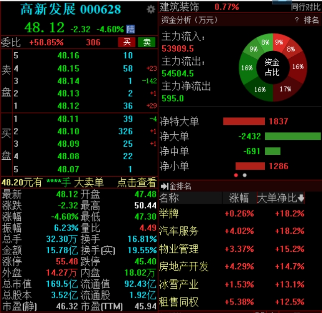 4月29日,高新发展大幅低开,截至发稿,该股跌超4%,报48.12元,换手率16.81%。