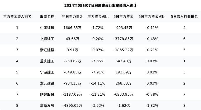 从主力资金流向来看,房屋建设行业今日主力资金流入10.58亿元,在所有申万二级行业中排名:67/131。