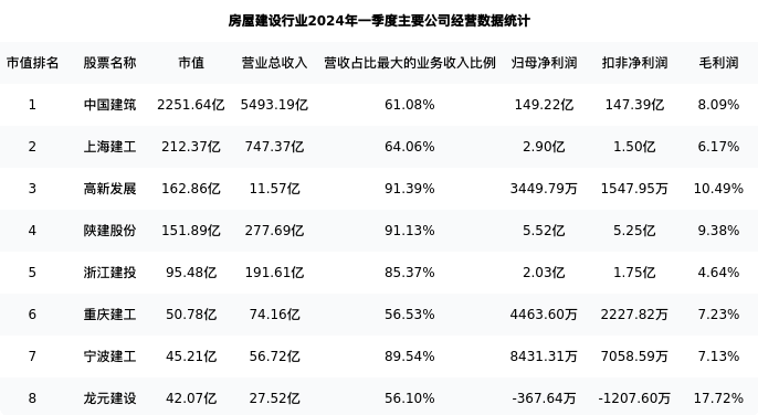 高新发展最新报告期数据为一季度,下表汇总了房屋建设行业内市值靠前的公司一季度主要经营数据