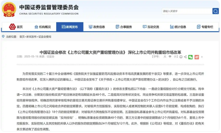 2025 年 5 月 16 日,证监会修订发布《上市公司重大资产重组管理办法》
