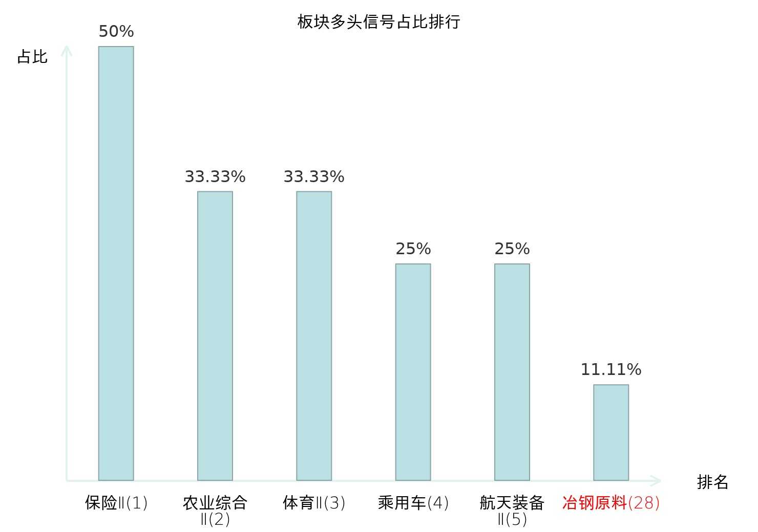全市场所有行业板块中主力多头信号占比排名中,保险Ⅱ板块位居第一。体育Ⅱ板块名次提升最快,较昨日上升127位。