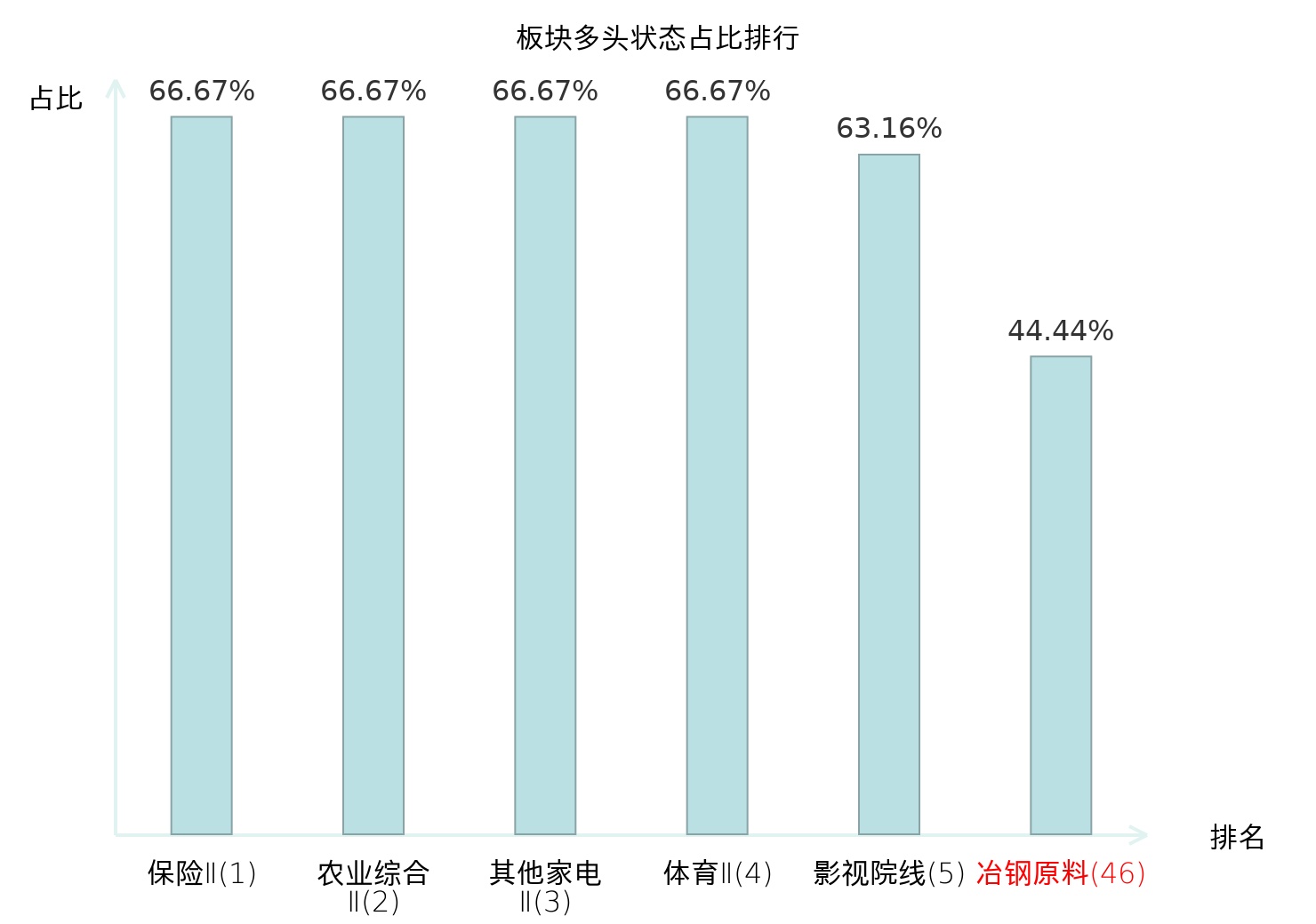 全市场所有行业板块中主力多头状态占比排名中,保险Ⅱ板块位居第一。冶钢原料板块名次提升最快,较昨日上升53位。