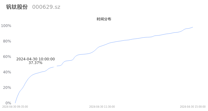 000629钒钛股份2024年04月30日成交154.42万手,成交金额4.84亿元,相较昨日放量41.51万手,换手率1.68%,成交清淡。