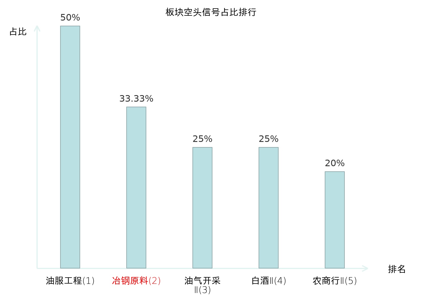全市场所有行业板块中主力空头信号占比排名中,油服工程板块位居第一。白酒Ⅱ板块名次提升最快,较昨日上升110位。