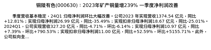 值得注意的是:2024年05月国信证券的刘孟峦/焦方冉分析师,首次发布关于铜陵有色的研究报告,标题为:铜陵有色(000630):2023年矿产铜量增239% 一季度净利润改善。