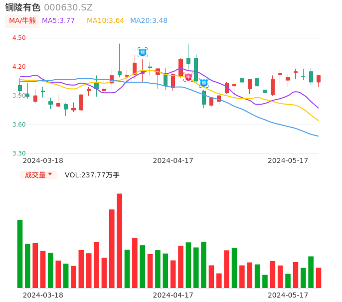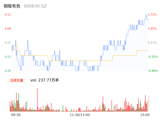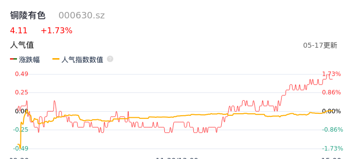 05月17日,铜陵有色收报4.11,股价涨幅1.73%,成交金额9.62亿元,换手率2.26%。
