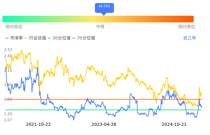 铜陵有色当前市净率PB为1.37,在所属的工业金属中,市净率PB排22,前五名分别为中孚实业市净率0.81、万顺新材市净率0.98、常铝股份市净率0.99、新疆众和市净率1.00、明泰铝业市净率1.01。铜陵有色当前市净率PB为1.37,超过近3年49.79%的历史数据。