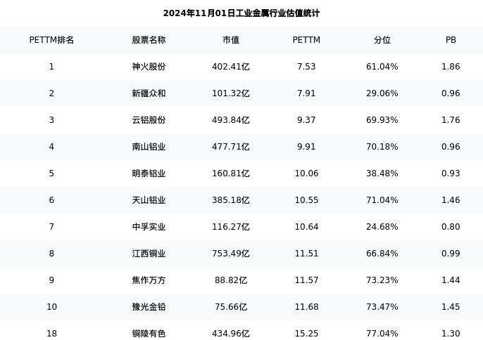 从估值角度看:铜陵有色最新市盈率PETTM为15.25,在行业内排名17/58,处于77.04分位。