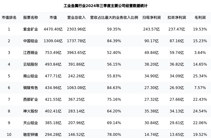 铜陵有色最新报告期数据为三季度,下表汇总了工业金属行业内市值靠前的公司三季度主要经营数据