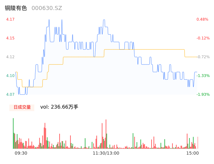05月15日,铜陵有色收报4.10,股价涨幅-1.20%,成交金额9.75亿元,换手率2.25%。