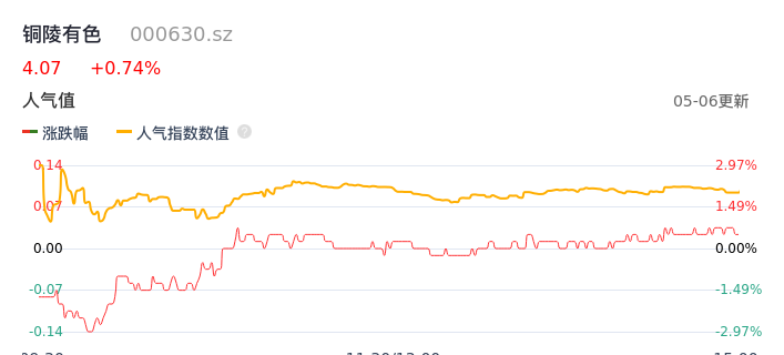 05月06日,铜陵有色收报4.07,股价涨幅0.74%,成交金额10.94亿元,换手率2.59%。