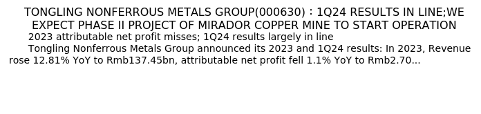 值得注意的是:2024年05月中金公司的Ding QI/Can ZENG/Yan CHEN分析师,首次发布关于铜陵有色的研究报告,标题为:TONGLING NONFERROUS METALS GROUP(000630):1Q24 RESULTS IN LINE;WE EXPECT PHASE II PROJECT OF MIRADOR COPPER MINE TO START OPERATION。