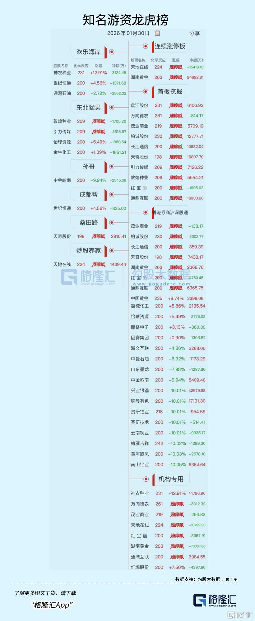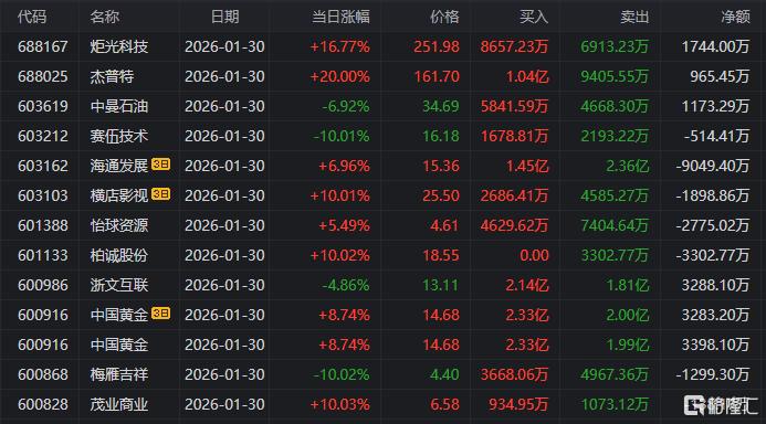 龙虎榜中涉及机构专用席位的个股中,当日净卖出额前三为湖南黄金、中曼石油、天地在线,分别为7.04亿元、2.44亿元、1.08亿元。