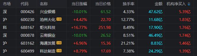 龙虎榜中涉及机构专用席位的个股中,当日净买入额前三为兴业银锡、炬光科技、云南铜业,分别为5.39亿元、1.76亿元、1.74亿元。