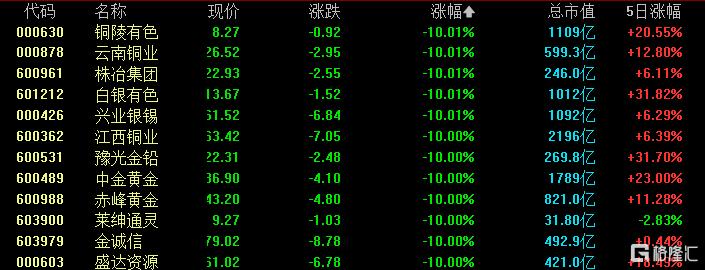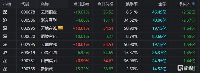 龙虎榜单日净卖出额前三为云南铜业、浙文互联、铜陵有色,分别为2.62亿元、2.37亿元、1.59亿元。