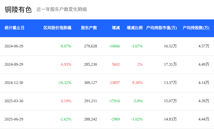 铜陵有色(000630)在2025年第二季度的股东户数为28.82万,与2025年第一季度相比,股东户数减少了1.02%,而户均持股数量则增加了1.03%。户均持股市值为14.83万元,较上一季度下降了1.61%。