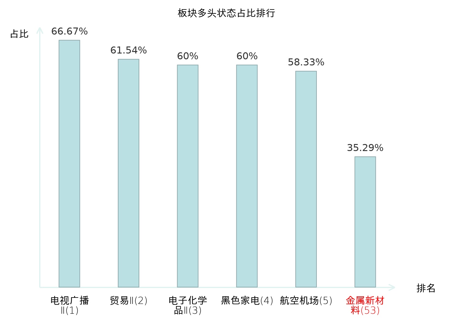 全市场所有行业板块中主力多头状态占比排名中,电视广播Ⅱ板块位居第一。黑色家电板块名次提升最快,较昨日上升80位。