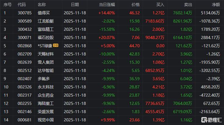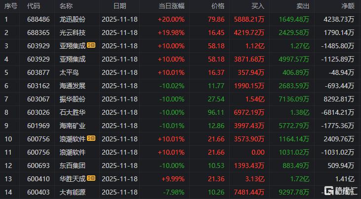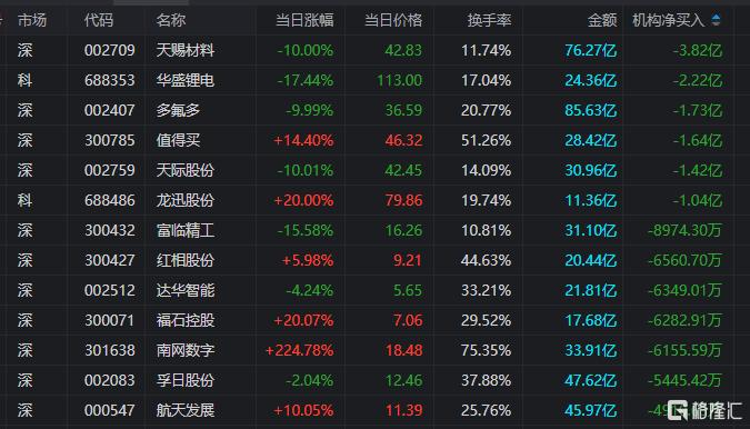 龙虎榜中涉及机构专用席位的个股中,当日净卖出额前三为天赐材料、多氟多、值得买,分别为3.82亿元、1.73亿元、1.64亿元。