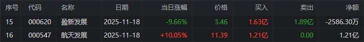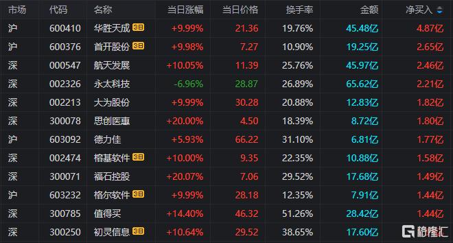 龙虎榜单日净买入额前三为航天发展、永太科技、大为股份,分别为2.46亿元、2.21亿元、1.82亿元。