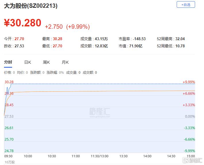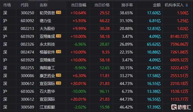 龙虎榜中涉及机构专用席位的个股中,当日净买入额前三为德力佳、大为股份、永太科技,分别为1.25亿元、1.02亿元、7596.86万元。
