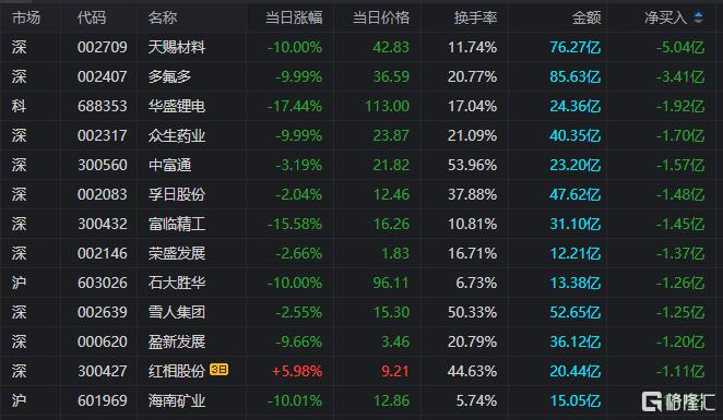 龙虎榜单日净卖出额前三为天赐材料、多氟多、众生药业,分别为5.04亿元、3.41亿元、1.70亿元。