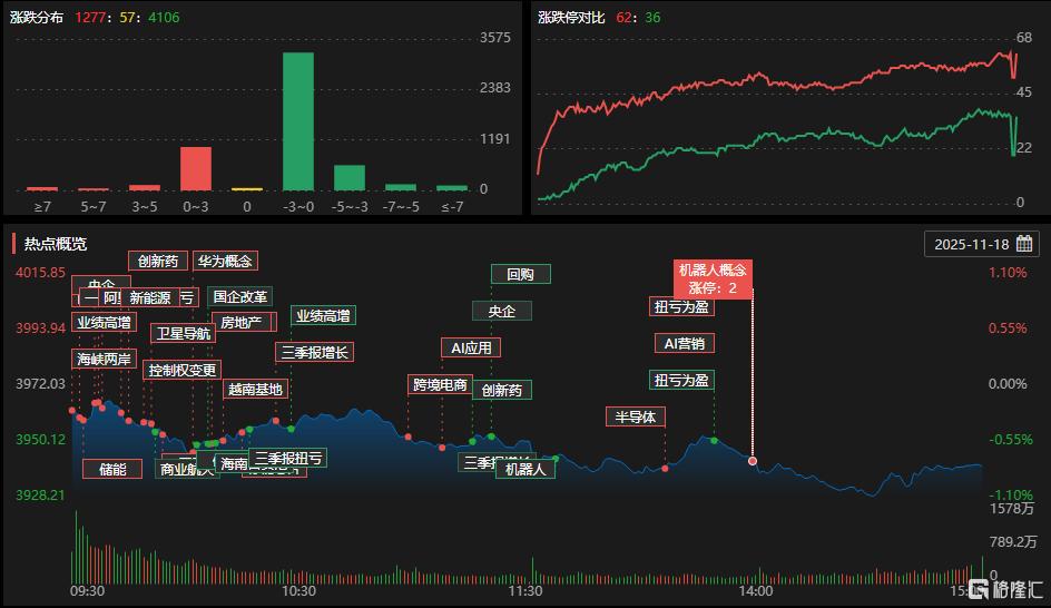 11月18日,沪深两市成交额1.93万亿,较上一个交易日放量153亿。板块方面,小红书概念、Sora、互联网电商、AI应用、软件开发、半导体等板块涨幅居前,电池、煤炭、钢铁、有机硅、工业金属等板块跌幅居前。