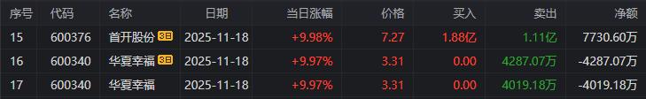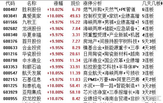 高位股方面,胜利股份6连板,真爱美家、九牧王5连板,龙洲股份、华夏幸福4连板,首开股份5天3板,合金投资4天3板,华瓷股份、中水渔业、和顺石油等3连板。