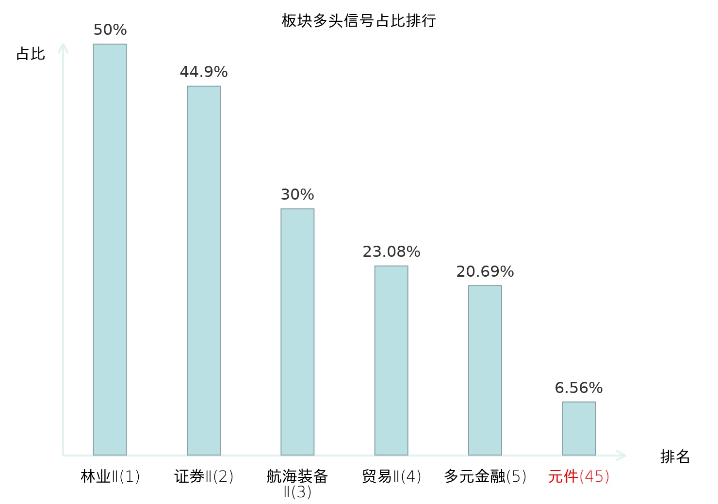 全市场所有行业板块中主力多头信号占比排名中,林业Ⅱ板块位居第一。林业Ⅱ板块名次提升最快,较昨日上升125位。