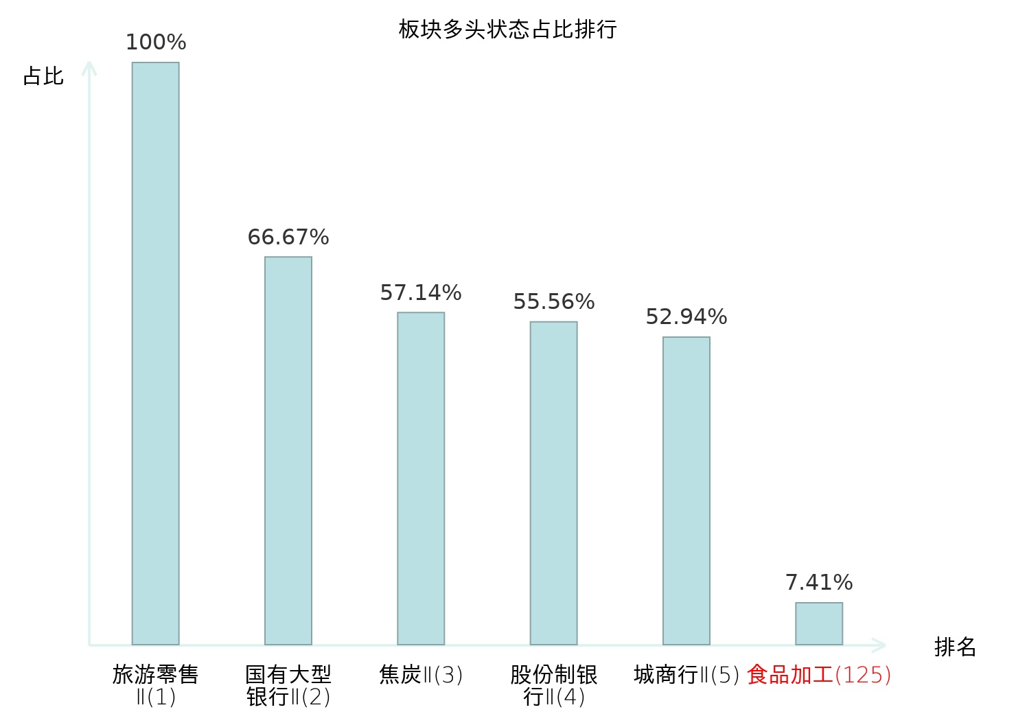 全市场所有行业板块中主力多头状态占比排名中,旅游零售Ⅱ板块位居第一。其他家电Ⅱ板块名次提升最快,较昨日上升101位。