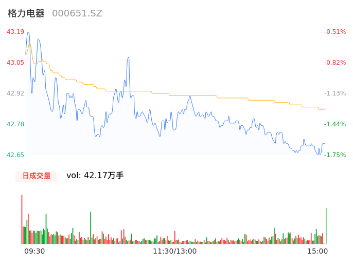 05月07日,格力电器收报42.67,股价涨幅-1.70%,成交金额18.07亿元,换手率0.76%。