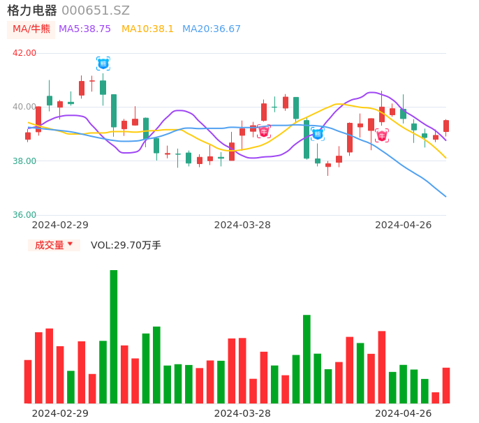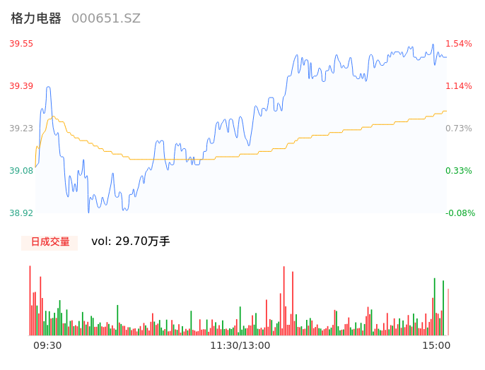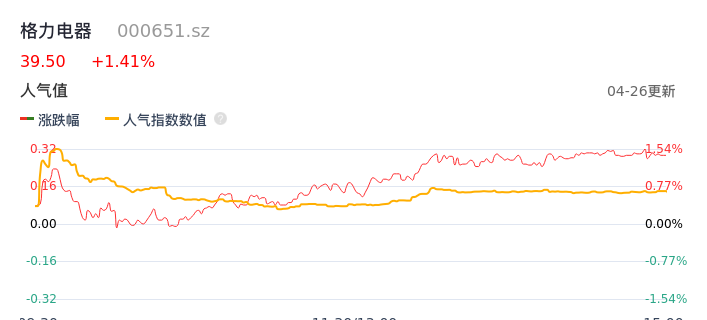 04月26日,格力电器收报39.50,股价涨幅1.41%,成交金额11.67亿元,换手率0.53%。