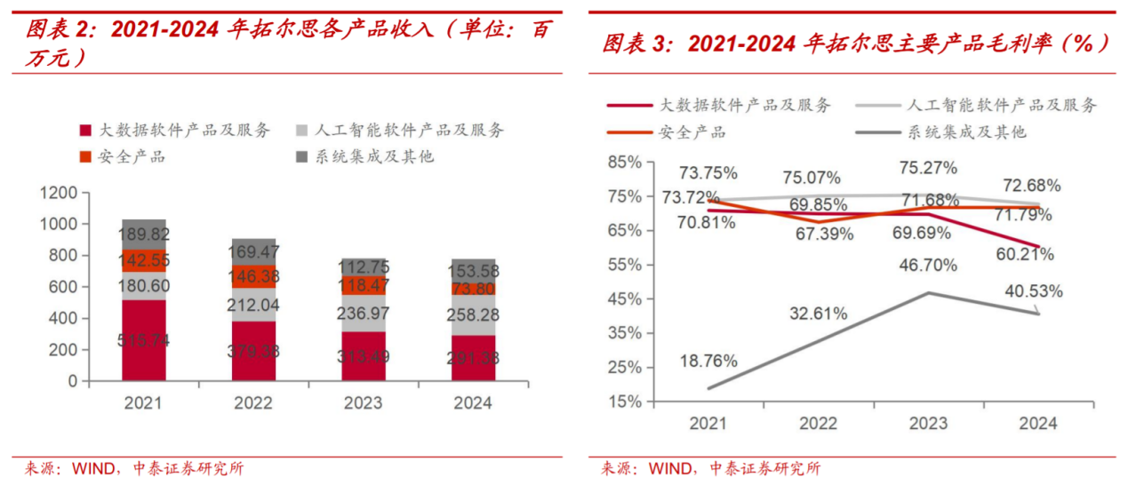 公司在金融科技、媒体融合、舆情监测、数字政府门户等细分领域处于行业领先地位。All in AI,中文全文检索技术首创者,以“数据+智能”为核心战略。公司向语义智能与数据服务生态全面转型,构建以拓天大模型一体化平台+拓天链智能体平台为核心的智能底座,深度融合行业知识图谱与海量高质量数据资产,在多个垂直领域率先落地大模型与智能体应用,2024年拓天大模型及智能体已成功应用于9大垂直领域40多个项目。剔除商誉减值和加力研发的短期扰动,宏观影响和产品转型下阴霾将散,带动营收规模和毛利结构的双重改善。