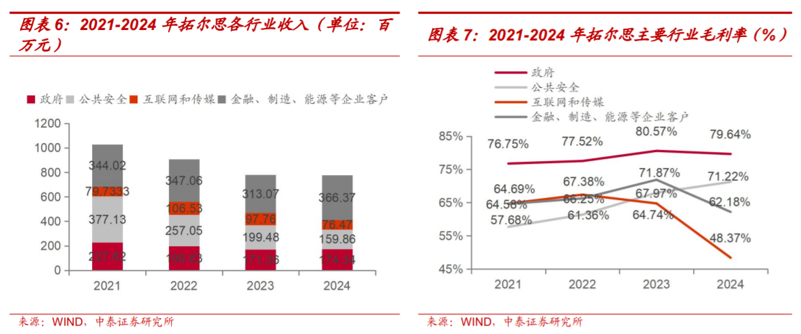 政府(2024年营收占比22.44%):2024年实现收入1.74亿,同比增长1.74%,毛利率57.21%。数字政府投入呈现出总体增长但项目小型化的趋势,项目数量同比增长13%,公司覆盖80%中央和国务院机构,64%省级政府,52%地市政府以及400多家地方金融监管单位,在政府网站集约化、金融监管、政务舆情等领域成熟,已有系统的运维收入维稳,政务新媒体传播数据推送服务及全国政务系统大模型应用贡献增量,目前已向自然资源部、贵州、广西、深圳等地政府单位提供智能政务问答助手服务。