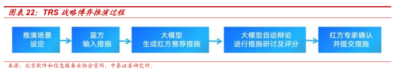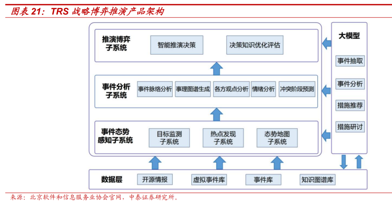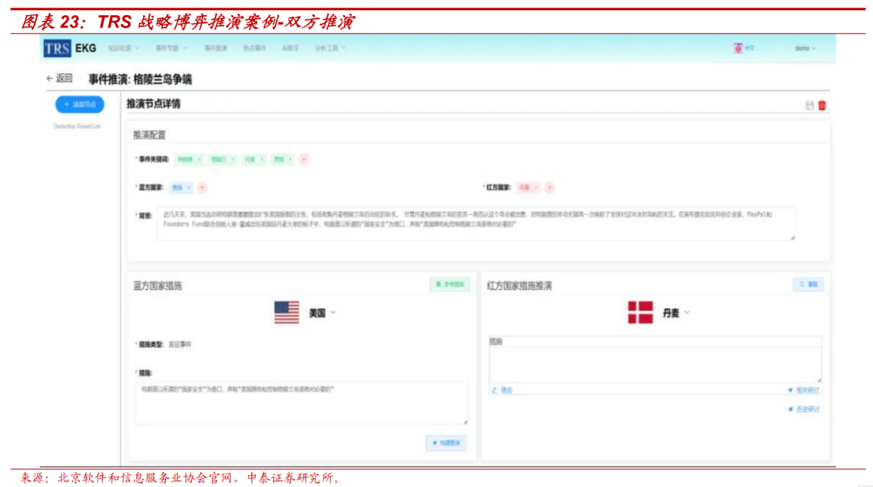 AI+作战辅助:TRS战略博弈推演产品,从数据到决策的认知跃迁。基于DeepSeekR1,公司构建了覆盖政治、经济、军事等多领域的智能推演系统,重点聚焦重大事件冲突推演、混合战争模拟、经济制裁效应仿真等场景。在推演过程中先基于事理图谱+精调模型,挖掘专业领域下因果逻辑关系;并利用RAG(检索增强生成)技术,自动生成内部优劣势及外部机会威胁等结构化证据,通过大模型驱动的结构化辩论技术,对比分析各方案优缺点及潜在影响,最终优选最合适的方案并提供决策依据。