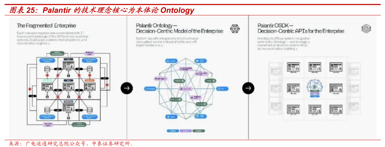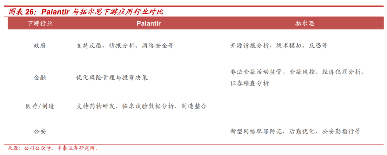 4)产品矩阵:军事和情报分析产品上拓尔思开源情报对标Palantir Gotham,人工智能平台上拓天·开源情报大模型对标Palantir AIP,平台底座上拓尔思技术中台大模型安全能力对标Palantir Apollo。