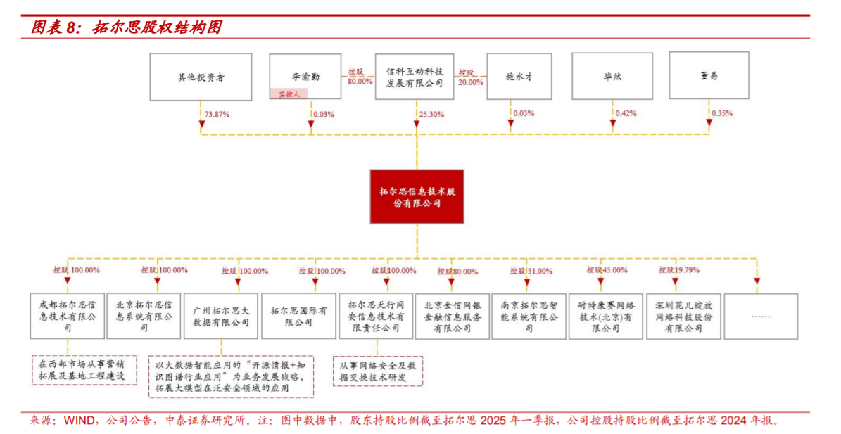 子公司广拓公司深耕公安、军工等垂直领域,发力开源情报及知识图谱行业应用。公司下属重点子公司中,成都子公司承建公司西部区域总部及大数据研发和运营服务基地项目;天行网安主要提供数据安全传输和交换产品及服务;广拓公司主要研发和销售知识图谱技术和大数据分析软件,深耕公安、军工等垂直领域,以"大数据+知识图谱+大模型"为核心技术,通过迭代安拓·知识图谱平台及天鉴·资金分析等产品,拓展政务多领域知识图谱应用,依托专业人才与区域扩张实现开源情报业务增长。