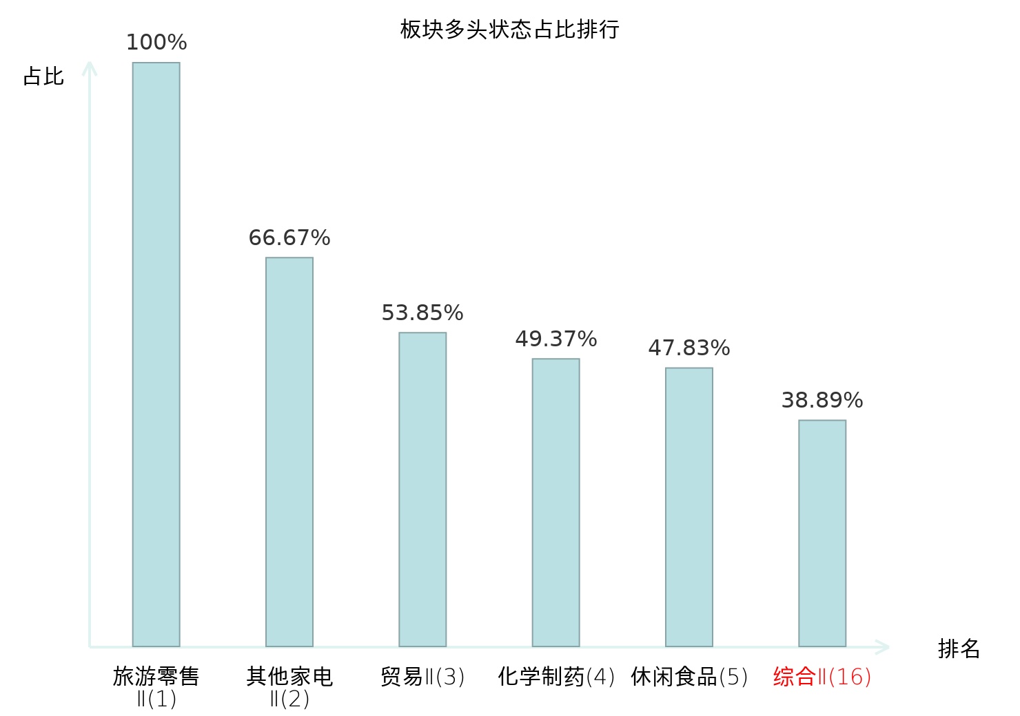 全市场所有行业板块中主力多头状态占比排名中,旅游零售Ⅱ板块位居第一。互联网电商板块名次提升最快,较昨日上升55位。