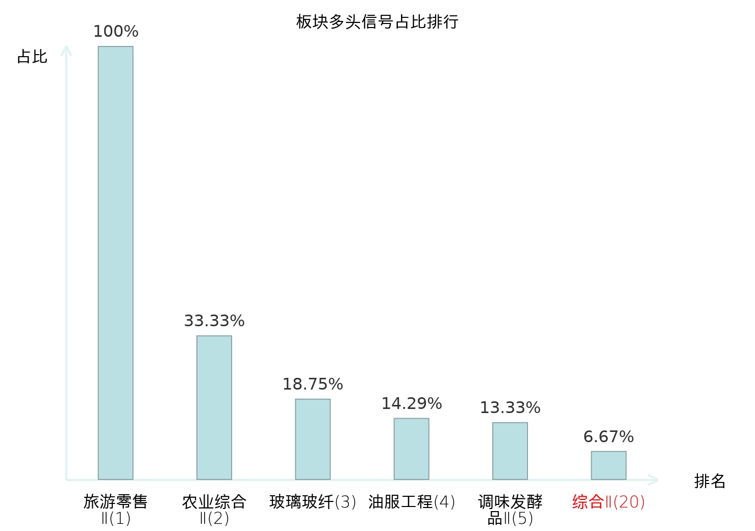 全市场所有行业板块中主力多头信号占比排名中,旅游零售Ⅱ板块位居第一。旅游零售Ⅱ板块名次提升最快,较昨日上升130位。