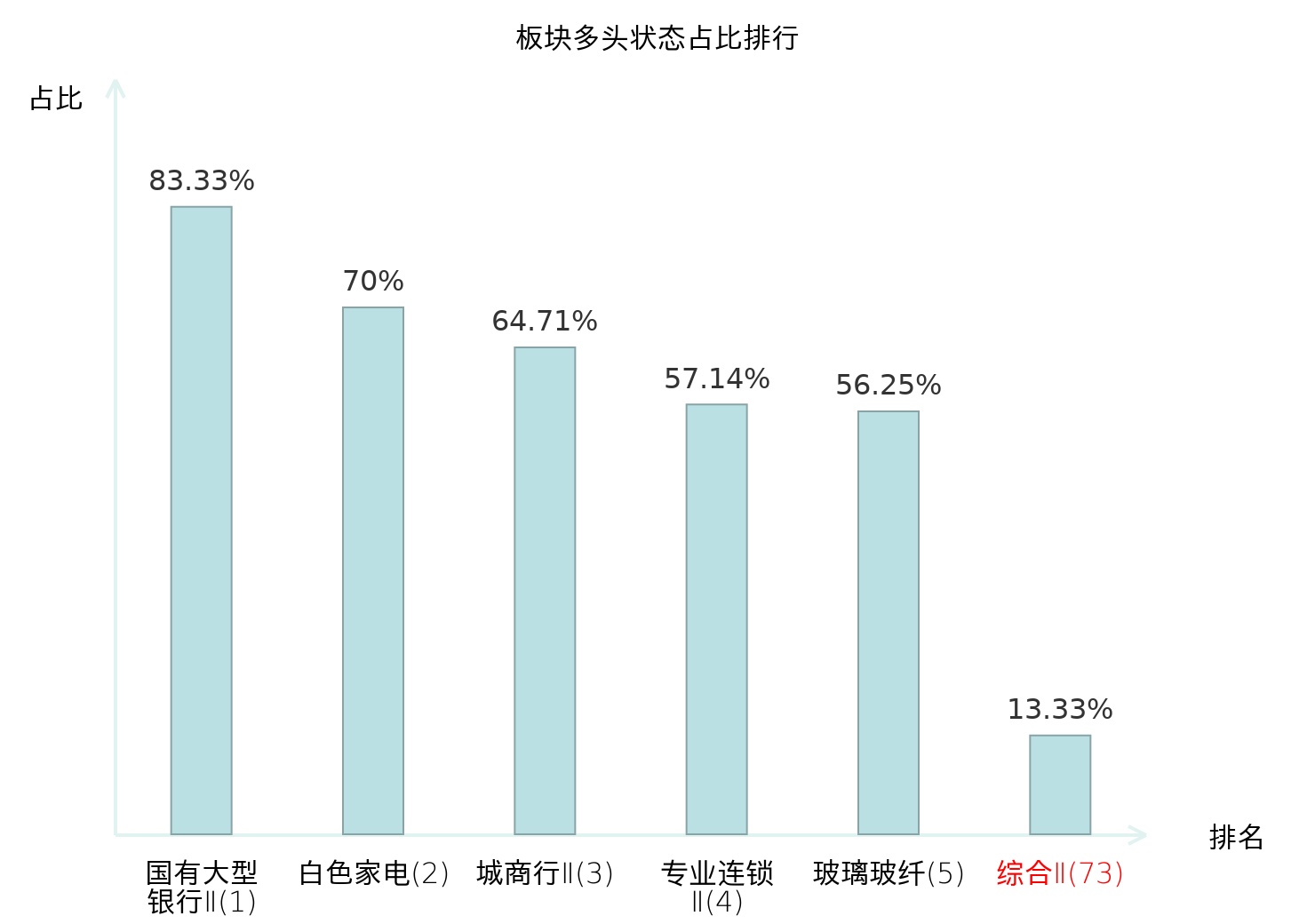 全市场所有行业板块中主力多头状态占比排名中,国有大型银行Ⅱ板块位居第一。食品加工板块名次提升最快,较昨日上升51位。