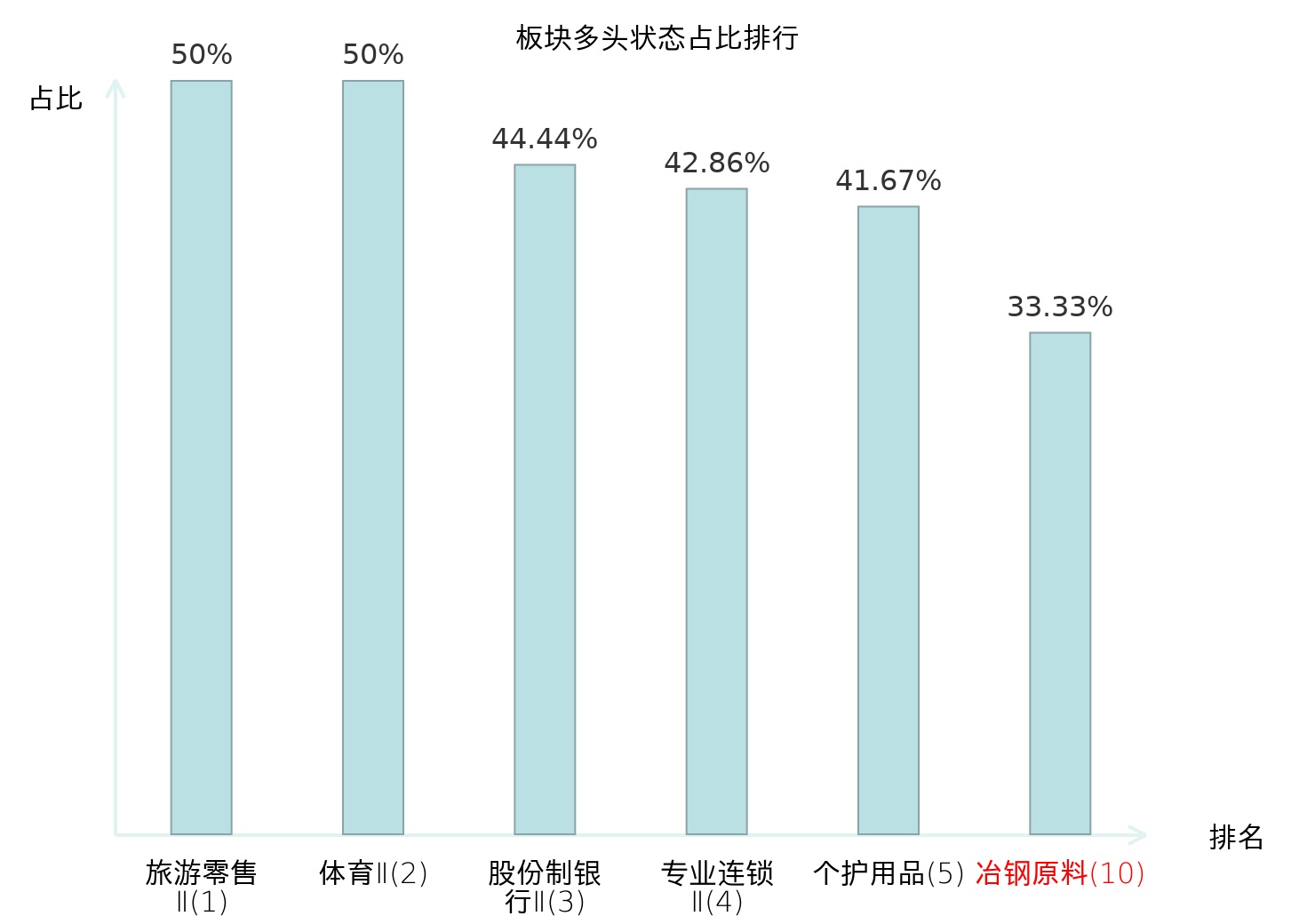 全市场所有行业板块中主力多头状态占比排名中,旅游零售Ⅱ板块位居第一。贵金属板块名次提升最快,较昨日上升83位。